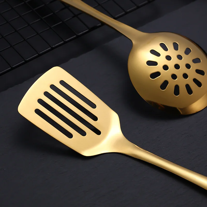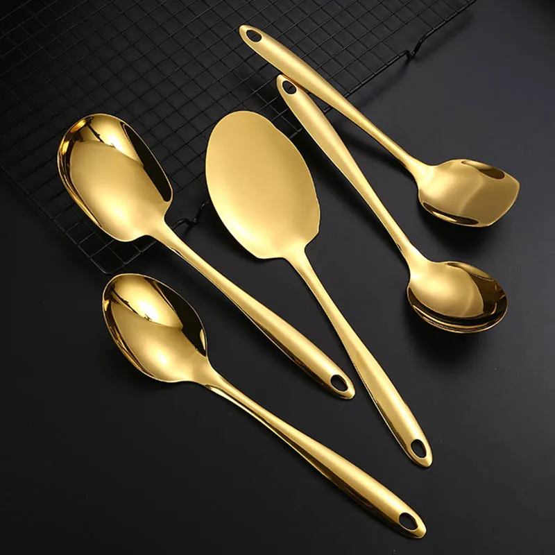 Golden Stainless Steel Cooking Tool Coreano Soup Spoon Hot Pot Colander com Long Handle Outdoor BBQ Shovel Cozinha Acessórios